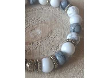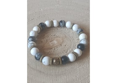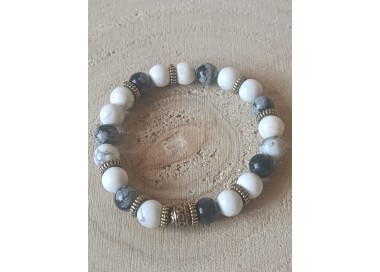 Je vous propose un bracelet monté sur fil élastique, en perles de 8mm, composé de pierres naturelles d'Howlite et Obsidienne flocons de neige.